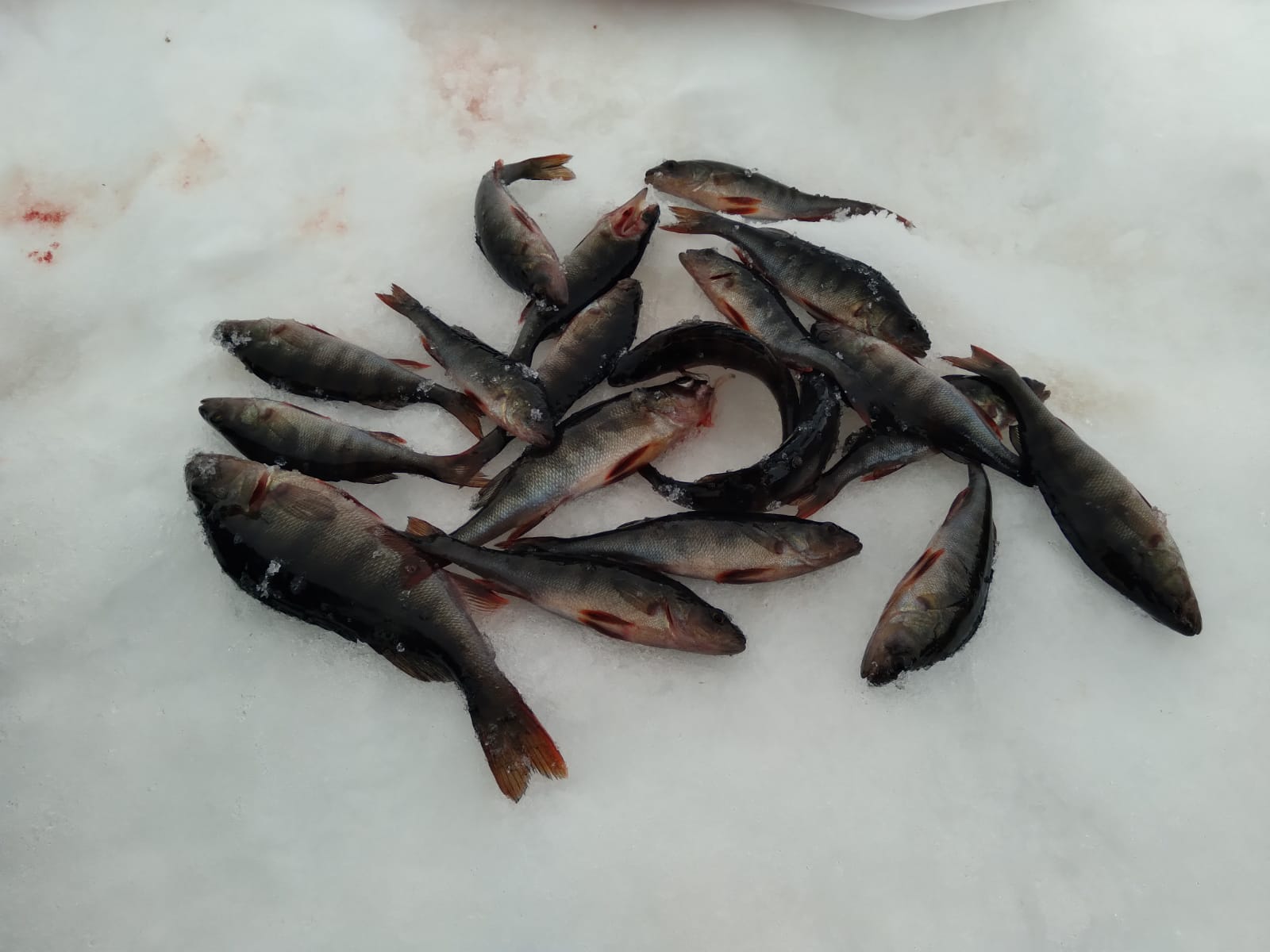 Достаю из лунки хорошего горбача, клюнул на верхнюю мормышку, а внизу ещё кто-то дёргается, да так знатно упирается. Вытаскиваю второго почти наполовину, и тут леска рвётся на узле, окунь уходит в лунку, я ныряю рукой за ним! Накололась до крови, но я его достала! Результат: первый окунь - 470, второй - 550 гр.