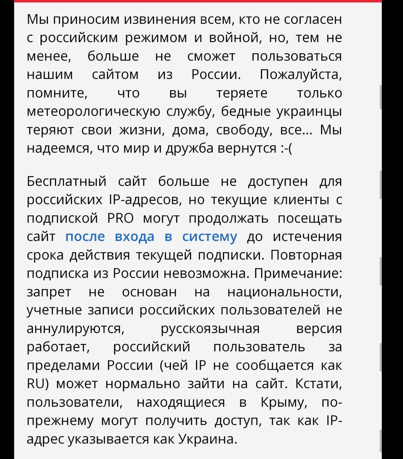 Мы приносим свои извинения всем тем, кто не согласен с российским режимом и войной, но тем не менее больше не сможет пользоваться нашим сайтом из России, помните, что вы только теряете службу погоды, бедные украинцы теряют жизнь, дома, свободу. , всё... Надеемся, что мир и дружба вернутся