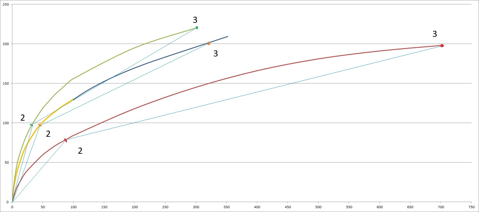 ТП400 Проф в общем то по графику полный аналог шимано (были отличия, но, видимо, чисто технического свойства). График резко отличается от предыдущей троицы. Точка 2 отнесена гораздо дальше, при этом точки 2 и 3 очень сближены.