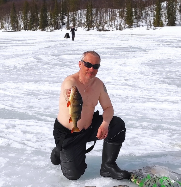 Решили и поехали. Попытка сойти со следа - садишься мгновенно, снегу по развилку примерно и он как вода. Добрались без проблем, хотя было уже поздновато...пока определились с местом, поставили вигвам, попили кофе...на лед выбрался к 18.00,не особо рассчитывая. И вдруг-поперло! где-то до 19.30 поймал с десяток окуней. Не просто окуней, а окуней 600-800