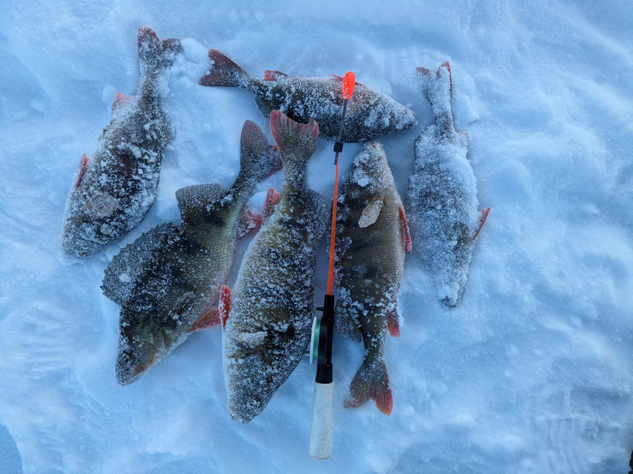 Сегодня добрался до озера где был в крайний раз еще лет наверное в 18-19. И бывал там только летом, каково же было разочарование когда стал бурить лёд. Где не просверлю, хоть 100-150 метров от берега то везде в дно. Хотя в те года ловились окуня по 300-350гр и щук тоже видел в озере. Решил проехать дальше, на следующее. Рыбу там не ловил, но подозревал что она там есть. Стал ставить удочки, Глубина начиналась от 3.5 метров, когда ставил третью удочку, первую стало неистово загибать. В итоге за первый час ловли около 2-х десятков окуней, мог поймать и больше ,но решил ставить жерлицы на щуку, а в это время удочки гремели бомбили. я часть даже выдернул из воды чтобы не нервировали. На одну из жерлиц было две размотки, но так никто так и не засекся, думаю что это был окунь покрупнее. Живчик стоял ну грамм 50 от силы. По итогу как все началось так резко и закончилось. Просидел всего около 5 часов, но в последние 3 часа наверное 3 окуня поднял. В итоге с блесной стал засыпать на лунке , шел с утра плотный снег и ветер всё набирал набирал обороты, решил свернуться и ехать в сторону дома. Не доехал, остановился на избушке одного из соседних озер, растопил печку, просушил штаны. Часа 2 поспал и вот уже после всего полученного кайфа и антуража двинул к дому.