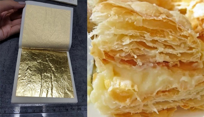 Сусальное золото (пластинки золотой фольги толщиной 0,1—1 мкм) уже 3 000 лет производят с помощью многочасовой ручной ковки, постепенно утончая «книжечку» из золотых пластинок, разделенных прокладками из оболочки слепой кишки. Слоеное тесто готовится почти так же, только вместо молота и наковальни используются поверхность стола и скалка. Раскатанное в тонкий слой тесто обильно смазывается маслом, складывается конвертом и снова раскатывается, для того чтобы после выпечки слои теста разделились и получился воздушный хрустящий пирог.