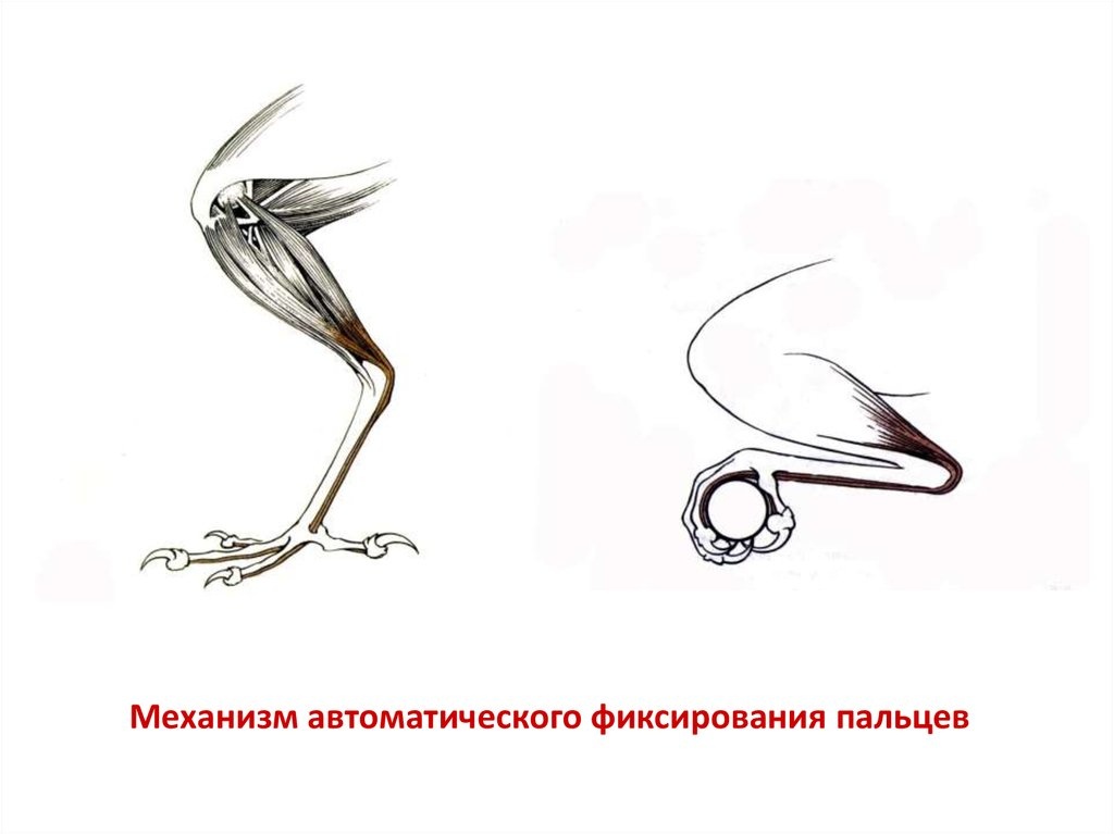 Обычно во время отдыха животные принимают позу, в которой они могут максимально расслабить мышцы. Но для большинства птиц спокойный сон, наоборот, возможен лишь при напряжении мышц ног, которые помогают им устойчиво, не теряя равновесия, сидеть на ветке или жердочке. Эти мышцы длинными сухожилиями соединены с пальцами.