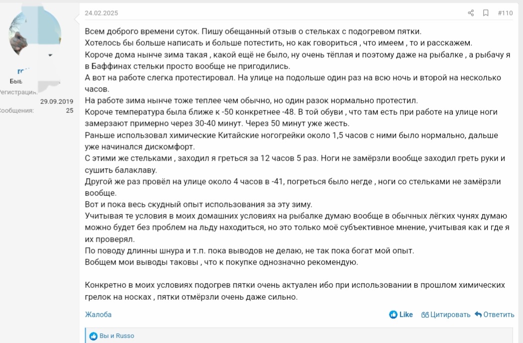 Доброе утро! Отчёт по стелькам комфорт. Опробовал, банк на 20000, конкретно мне хватает на 10 подогревов точно, может и больше. Кому-то хватит на больше циклов подогрева. У меня ноги мёрзнут сильно, травмы и тд и тп. Провода не мешают, вещь рабочая однозначно! Спасибо производителю!